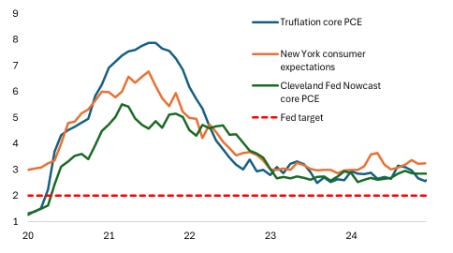 Figure 1: Truflation core PCE, Nowcast core PCE, NY Fed consumer expectations (Y/Y, %)