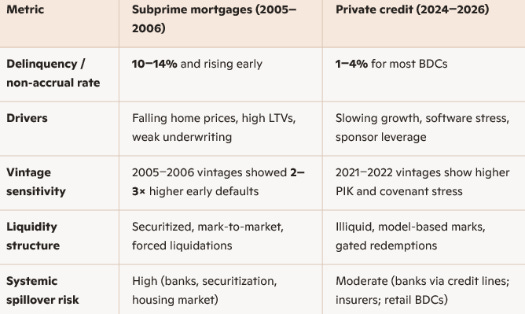 In 2005-2006, delinquencies on subprime mortgage loans had already surged to 12% and deteriorated more quickly than private credit non-accruals (see Table 1). Nonetheless, the parallel between subprime and private credit is “zip codes.”