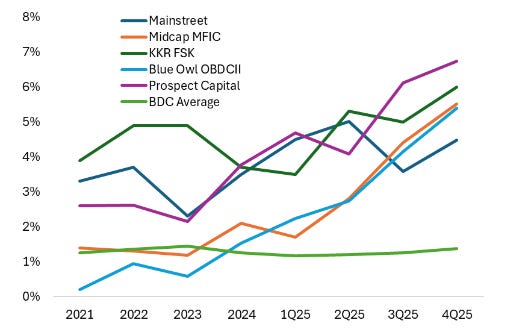KKR reported similar increases in non-accruals in one of its private credit funds (the FSK fund, which has 16.4% in software). Additionally, a UK lender, MFS, failed due to loan fraud and double-pledging, which entangled Apollo and several banks.