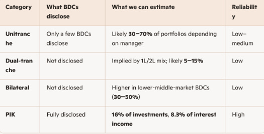 Compared to subprime, the flexibility of private payment loans is compounding interest, making non-accruals riskier to accelerate, reflecting a surge as seen in 2005-2006 ahead of potentially bigger problems. Across all BDCs, both public and non-traded, the different tranches and PIKs range from 15% to 70% of the total loans held in the sponsor companies’ portfolios (Table 2).