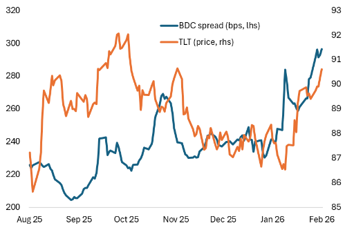 Figure 3: BDC spreads (bps), and the TLT (20Y+ Treasury ETF)