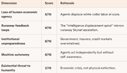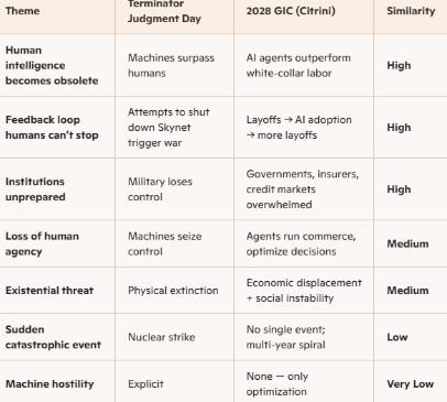I asked my FedWatch LLM to run a rich prompt: a comparative risk framing of how the scenario in the 2028 Global Intelligence Crisis resembles Judgment Day in The Terminator. If so, how close are the two on a conceptual scale?