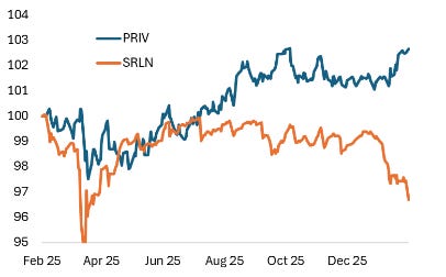 Such is now evident in distressed senior loans (and collateralized loan obligations). At the same time, a diversified basket of private credit still holds, for example, PRIV, which is a portfolio of public IG credit and a very careful selection of high-quality loans. In contrast, SRLN (Blackstone senior loans) is a portfolio of senior (bank and private) loans.