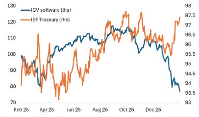As these Fed expectations lifted Treasuries, the price of the intermediate Treasury ETF (IEF, 7-10yr) is now the exact opposite of the bellwether software ETF, IGV, which traded to a low of 76.42, not seen since February 2023. The negative macro effect is now overhanging markets, rather than valuation or AI spending concerns (Figure 2).