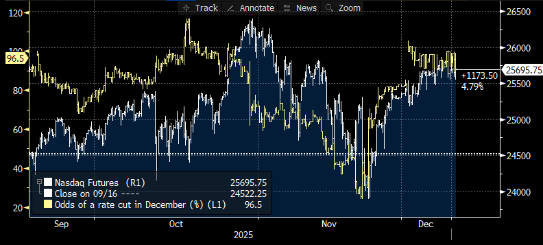 Figure 1: Nasdaq and Odds of a rate cut (%)
