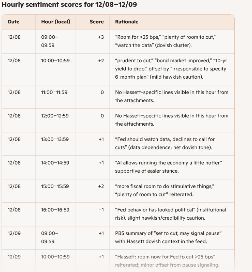 Table 1: LLM Output of Hassett’s comments about the Fed over the last 24-48 hours