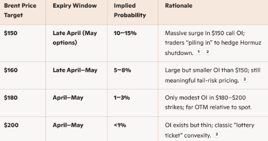 In oil markets, the odds of Brent reaching $150-$200/barrel are 10-15% for $150 by April-May, but less than 1% for $200/barrel, which is associated with a prolonged closure of the Strait (Table 2). Crude markets have been the key driver of expectations for the Fed (and other CBs), which, in turn, have driven yields higher.