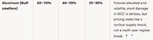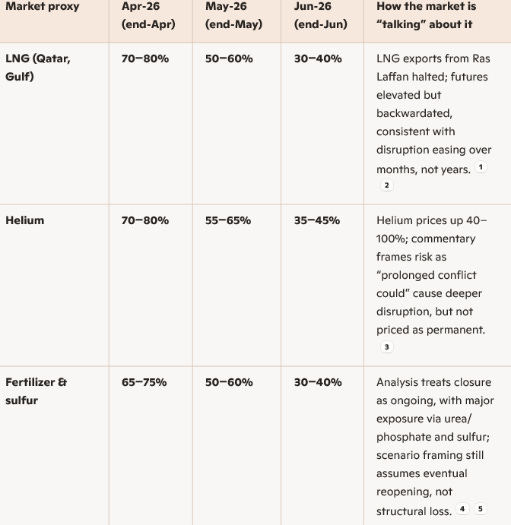 But by June, expectations are for partial reopening: pricing across LNG, helium, fertilizer, and metals is not consistent with a fully closed Strait through end‑June; markets are effectively saying “tail, not base case” for a truly long‑term closure (Table 3).