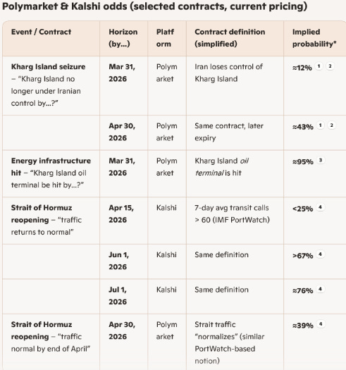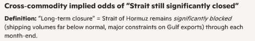 The FedWatch LLM estimates that several commodity markets have high conviction. “closure through April”: All four complexes are still trading as if a meaningful reopening before the end of April is unlikely.