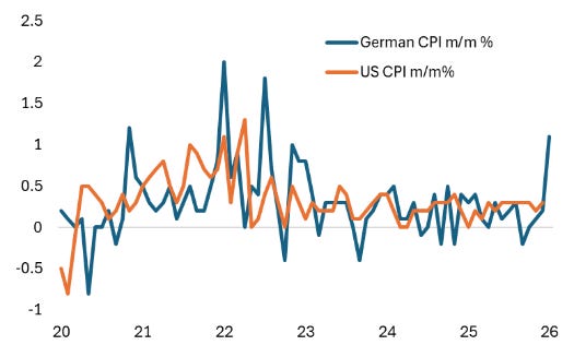 Figure 3: Germany CPI and US CPI (m/m, %)