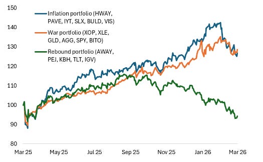 The inflation and war portfolio will switch in leadership as the wave of CPI prints comes out in the next few weeks. While betting on the rebound remains super tricky, such exposure can be hedged with the inflation portfolio, which is likely to perform well over the next few months.