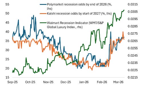 The Walmart recession indicator—ratio of Walmart stock to the S&P Global Luxury Index—has also risen. But this recession signal depends heavily on global luxury, which is now negatively affected by the war in luxury Mekka’s like Dubai and the UAE.