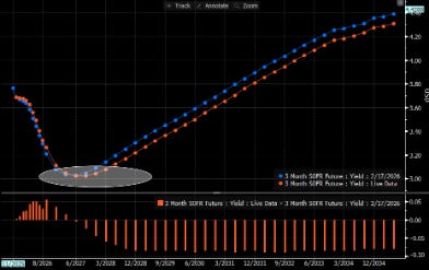 SOFR futures (contracts that price Fed policy) have shifted, now pricing in a new low for the Fed Funds rate by the “Citrini date”—June 2028—when the labor market may hit the AI iceberg (Figure 1).