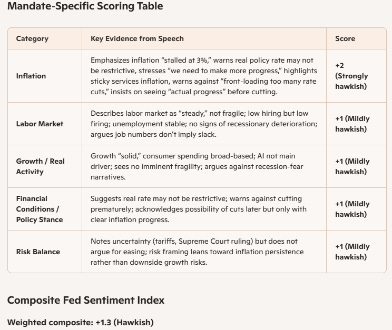 Goolsbee’s speech is therefore remarkably hawkish for his doing, especially as the LLM score is hawkish across themes—growth, inflation, and employment (see table 1).