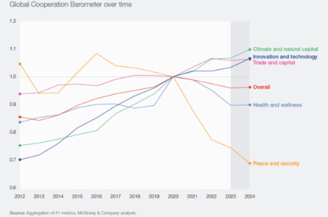 At the heart is this graph, which attempts to quantify cooperation and shows that cooperation has decreased significantly since 2020, especially in the areas of peace & security (see Figure 1).