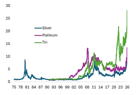 A reason these are affected by geopolitics is that silver responds mainly to safe‑haven flows and trade policy shocks; platinum is highly exposed to supply disruptions in South Africa and Russia; and tin is one of the most supply-concentrated metals on earth, making it extremely vulnerable to political instability in Southeast Asia.