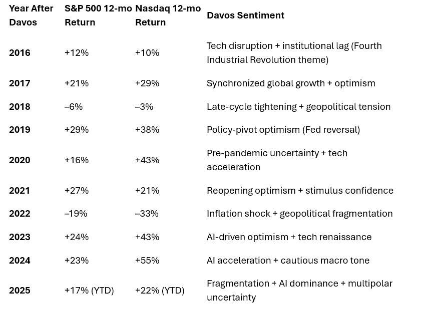 Table 1: S&P and Nasdaq historical returns (%) and Davos Sentiment