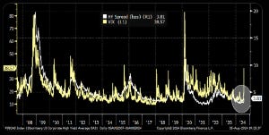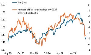 The dislocation between spreads and VIX means that High Yield will not catch up with volatility unless macro factors drive the yield curve bullishly steeper, i.e., the 2Y yield falls to 3 percent and below. With the “Yen put” lurking, there is more scope for emergency rate cuts to be removed to just one cut for 2024. If that process unfolds, the potential for a US stock rally, seen in the Nikkei overnight, becomes incrementally higher.