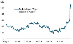 While the “Yen put” may have been initiated, it's clear that more action is required to be truly effective. The market is actively calling for an emergency inter-meeting cut, with the current probability at a significant 101% based on August Fed Funds futures, which settle right after Jackson Hole (Figure 2).